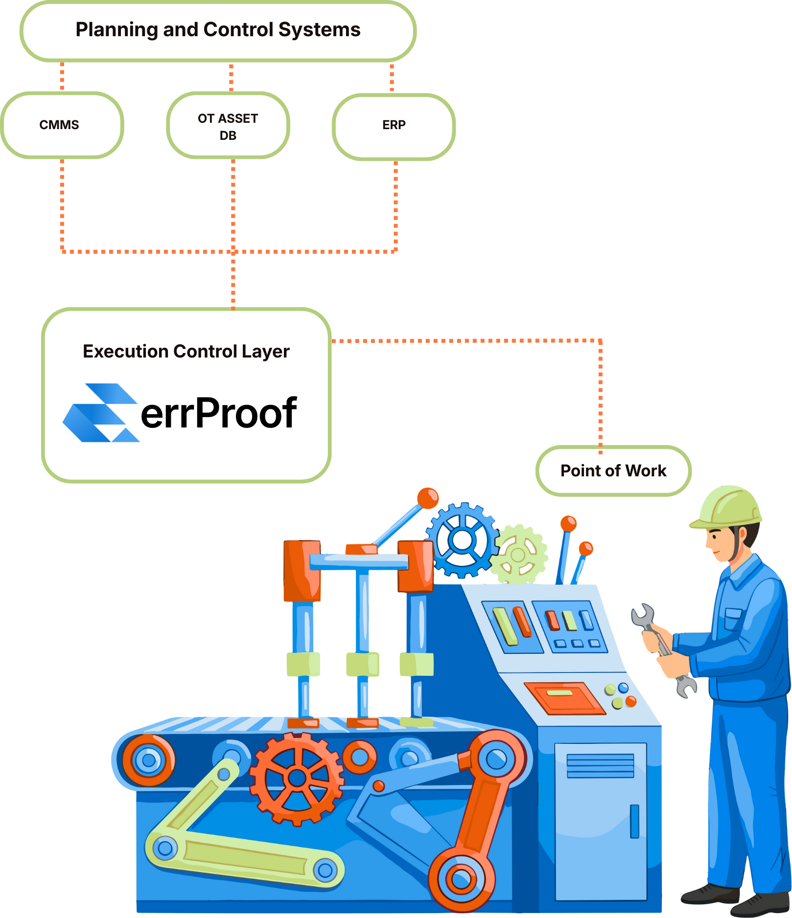 When systems of record do not exist, errProof functions as a unified execution and asset context layer, preventing incomplete, inconsistent, or erroneous data from entering downstream systems. Where CMDBs, Asset DBs, CMMS, and EAM platforms are in place, errProof complements them by governing execution itself, ensuring only verified, correctly executed work is passed downstream.
